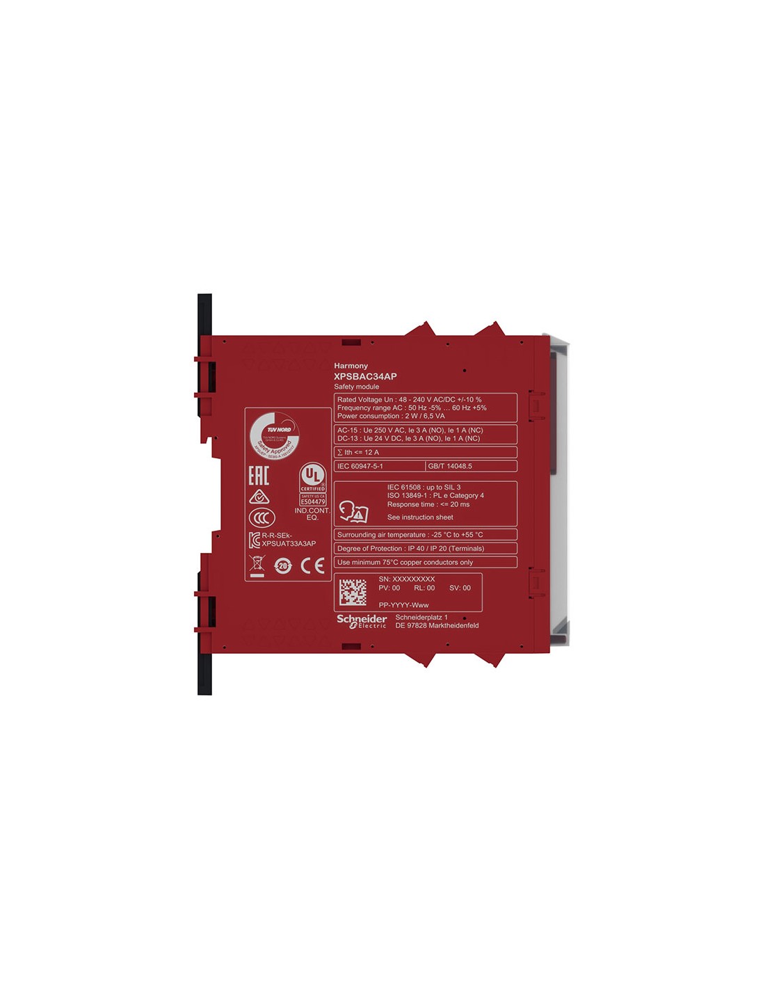 Este relé de seguridad está diseñado para monitorear el interruptor de parada de emergencia y guarda. El relé de seguridad está alimentado con 48-240 V CA/CC y equipado con un bloque de terminales extraíble de tornillo. Estos módulos de seguridad básicos incorporan funciones de seguridad predefinidas. Este relé de seguridad incorpora 1 salida de control, 4 salidas de seguridad NO y 2 salidas de diagnóstico NC. El nivel máximo de seguridad alcanzado por este relé de seguridad es PLe/Categoría 4 de conformidad con ISO 13849-1, SILCL 3 de conformidad con IEC 62061, SIL 3 de conformidad con IEC 61508. Este relé de seguridad pesa 0,200kg. Sus dimensiones son 22,5mm (ancho) x 120mm (profundidad) x 100mm (altura). Este relevador de seguridad es adecuado para aplicaciones tales como alimentos y bebidas, elevación, manejo de materiales, trabajo de materiales, embalaje. Este relé seguro cumple con las normas de seguridad funcional IEC 60947-5-1, IEC 61508-1, IEC 61508-2/-3, ISO 13849-1, IEC 62061, y está certificado por cULus, TÜV. Los relés de seguridad Harmony son compatibles con los controladores lógicos Modicon. Este relé está montado en un riel DIN simétrico de 35 mm. Harmony XPS Basic y los relés de seguridad universales son la primera opción para administrar fácilmente funciones de seguridad únicas, normalmente en máquinas de complejidad simple a media. Harmony XPS Basic ofrece la solución más optimizada para aplicaciones con módulos de seguridad cableados.