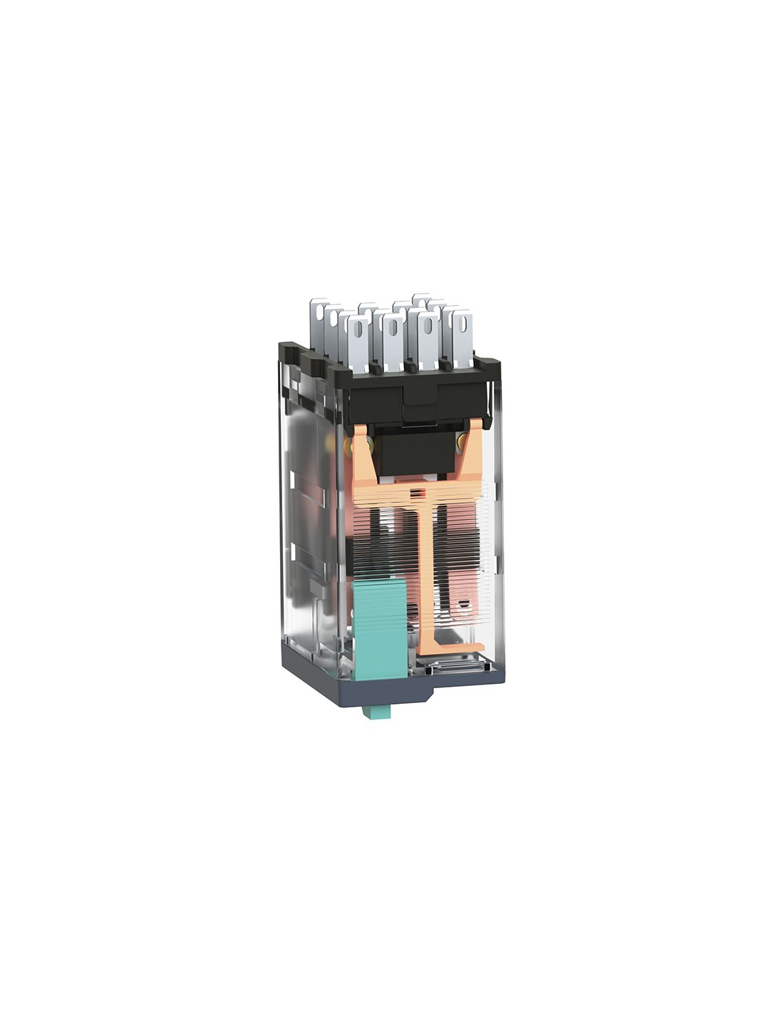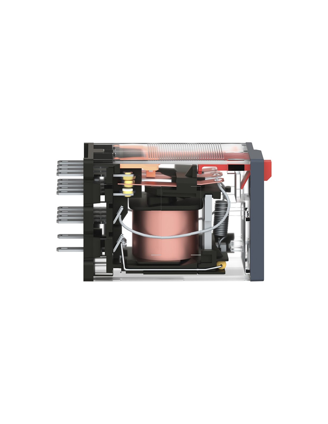 Este relé en miniatura enchufable Zelio RXM tiene una tensión de mando de bobina de 24 V CC y 4 contactos de inversión 4PDT (cuadripolar, bidireccional) con un calibre de 6 A. Dispone de una gran variedad en el número de contactos para el uso con una intensidad nominal alta, con un diseño que ahorra espacio. También ofrece un botón de prueba bloqueable en un solo paso y un LED de alimentación para indicar la disponibilidad. Ayuda a reducir el tamaño de los cofrets y aumentar la fiabilidad de la máquina, ya que puede montarse prácticamente en cualquier lugar. El producto es IP40 y tiene una cubierta transparente que permite al operador inspeccionar visualmente el estado de los contactos. Capacidad de funcionamiento en sistemas automatizados con lógica integrada para complementar las funciones de los controladores lógicos programables (PLC) industriales. Indicación de estado mediante LED, visible claramente de día y de noche.
