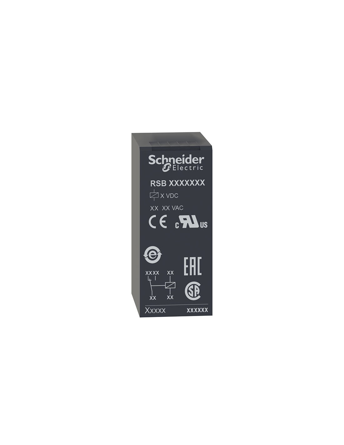 Este relé de interfaz enchufable Zelio RSB tiene una tensión de mando de bobina de 230 V CA y 2 contactos de inversión (bipolar, bidireccional) con un calibre de 8 A