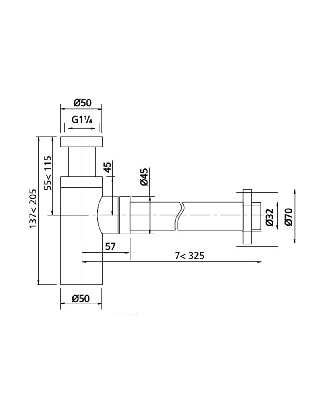 Sifón botella de latón con salida horizontal adecuado para lavabos y fregaderos.